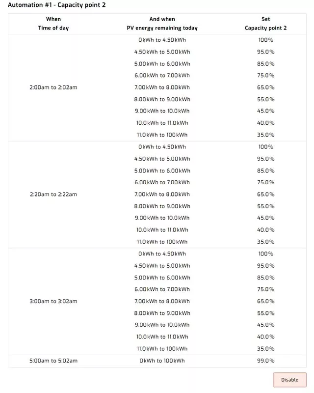For charging which is important right now as winter approaches and given the time it gets done not something I am likely to be monitoring I reverted to setting a hard coded capacity of 100% and grid charge in the work mode timer and just having the automations adjust the capacity and maximum charge rate.