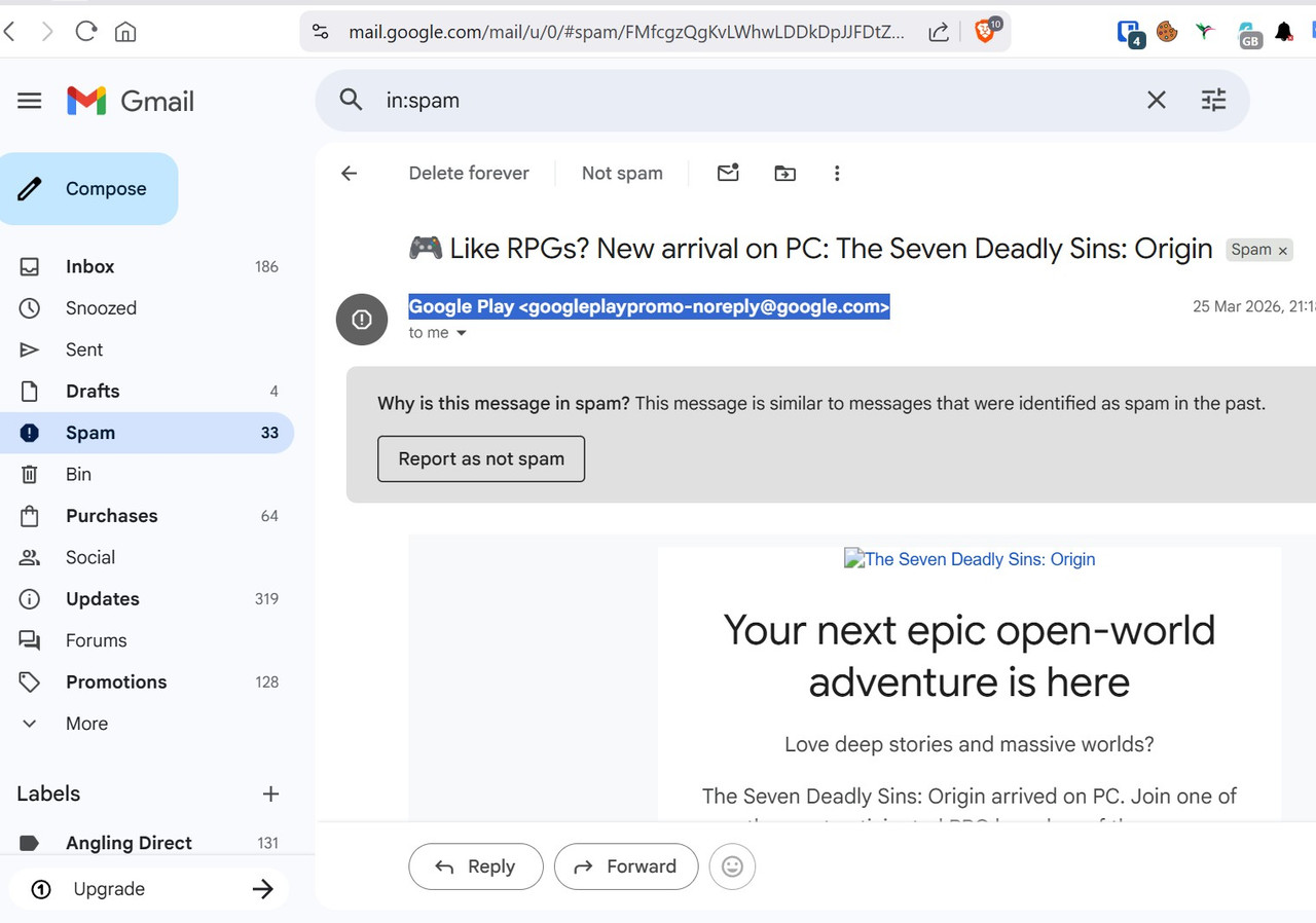 I had a quick look in my Gmail spam folder. As well as the expected scams there was a promo email from Google play. They got it right so far as I'm concerned as I don't do gaming but I wonder what their marketing department would make of that  :grin: