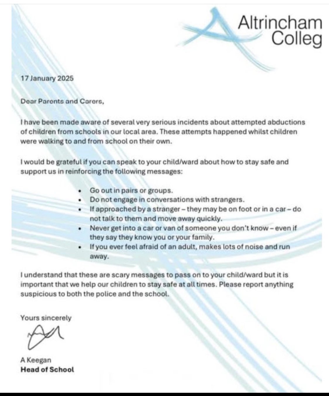 Letter sent to parents.....this was posted on Twitter as the school is in a triangle of migrant hotels.  If it is genuine it's very worrying for parents, of course it's not just Altrincham area where alleged 'abductions' are taking place.
