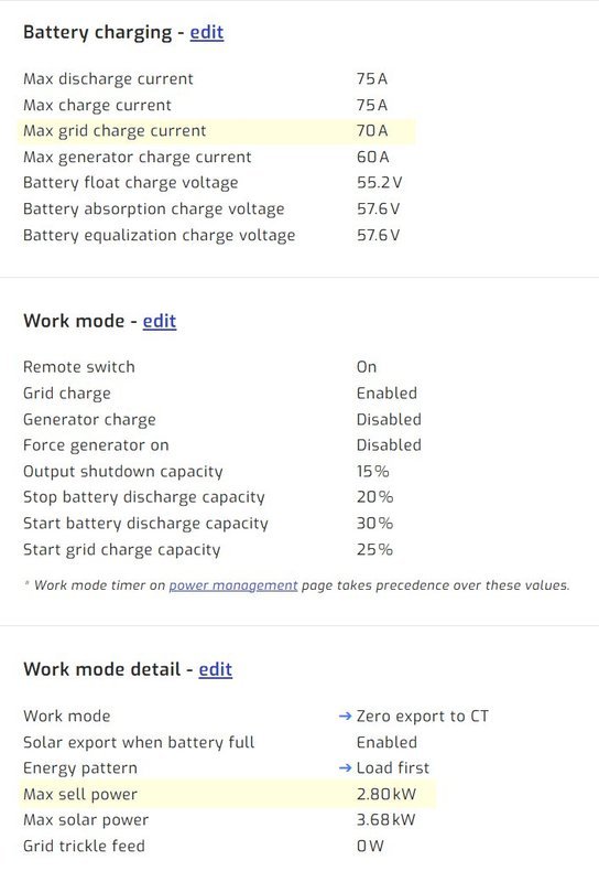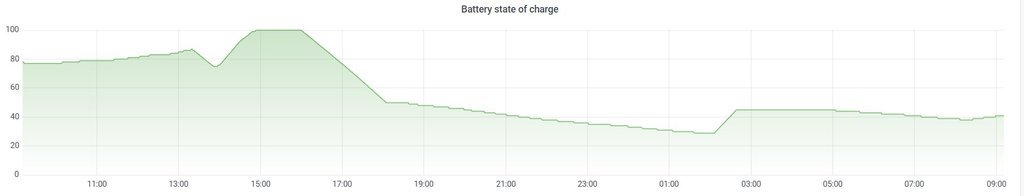 By carefully moving the cursor to the top and bottom of those periods it is easy to see the start and end times and start and end state of charge. From those calculate the hourly rate of charge and discharge which you need in the event an inverter adjustment is necessary. Be sure to check your permitted DNO export rate and the battery documentation for maximum charge current.
