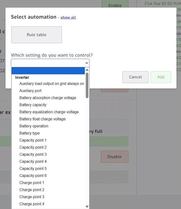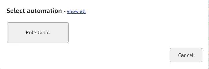 Clicking Rule Table results in a dropdown list of automations and with each permitting up to two selections for when the selected action takes place.