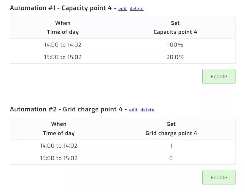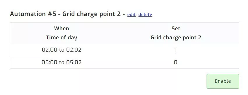 As overnight charging is pretty much essential I have for now decided to scrap the overnight charge automations and use the inverter Workmode Timer instead. I have set the capacity for my 2:00 to 5:00 slot to 100 and ticked Grid Charge.