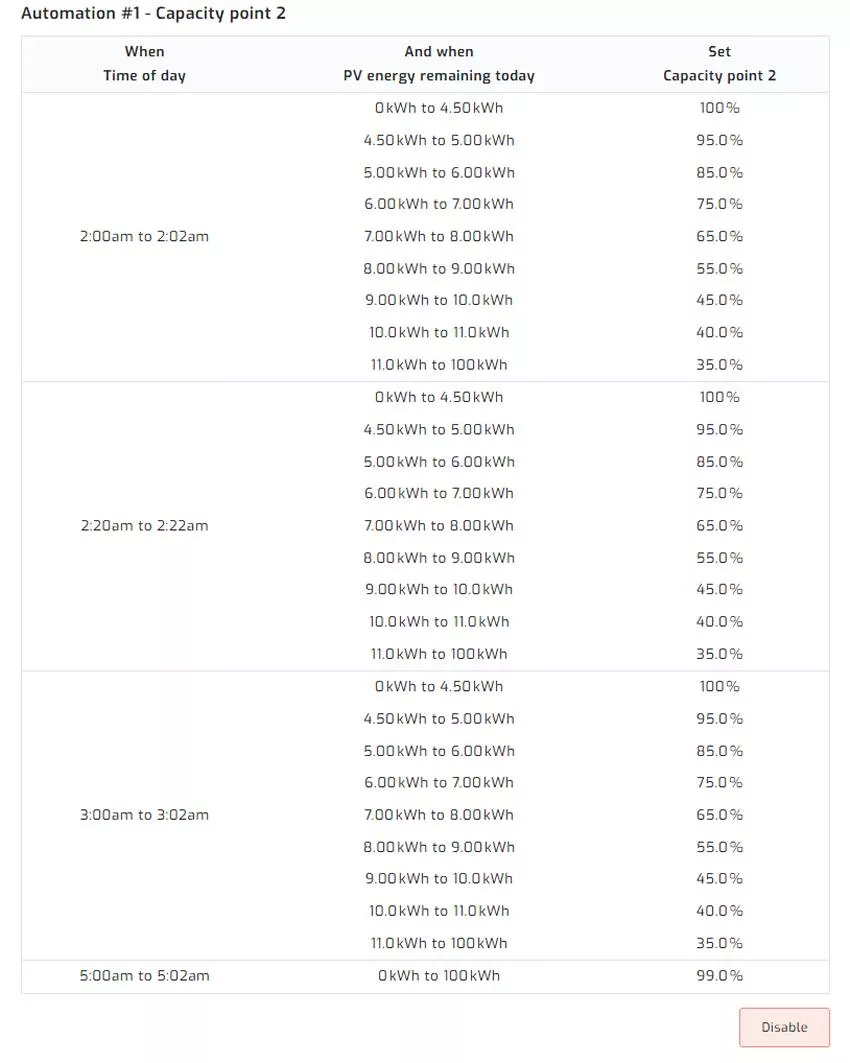 This is based on the minimum import needed to avoid grid import before Solar energy starts providing for daytime load and to reach as close as possible  to 100% by the 4:00pm export slot. As solar forecasts can be inaccurate and home load can vary this will be a compromise. There will be some tweaking needed for sure initially.
