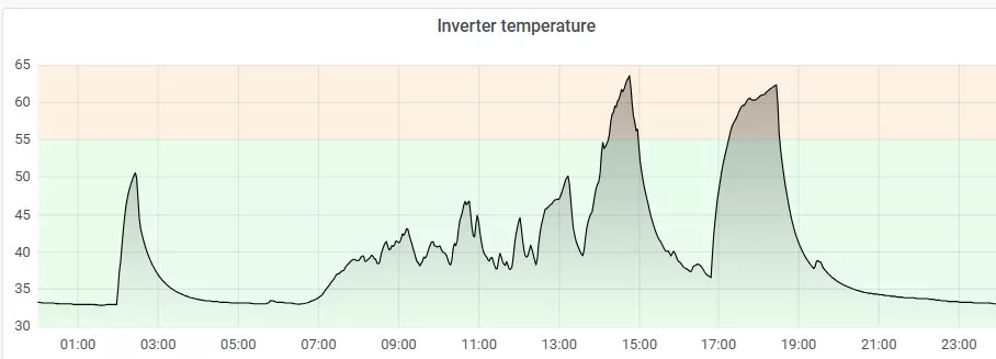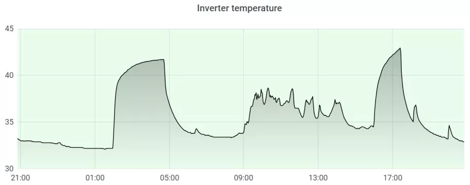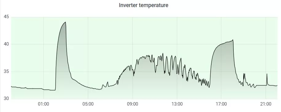 The temperature graph shows a curved rise during export and charging. Sometimes there was a double peaked top when the temperature rose above the green area. These seem to be signs of the inverter throttling back. For that reason I have set my Grid Charge Rate and Solar Export Rate at the lowest levels needed to complete those functions within the three hour time slots.