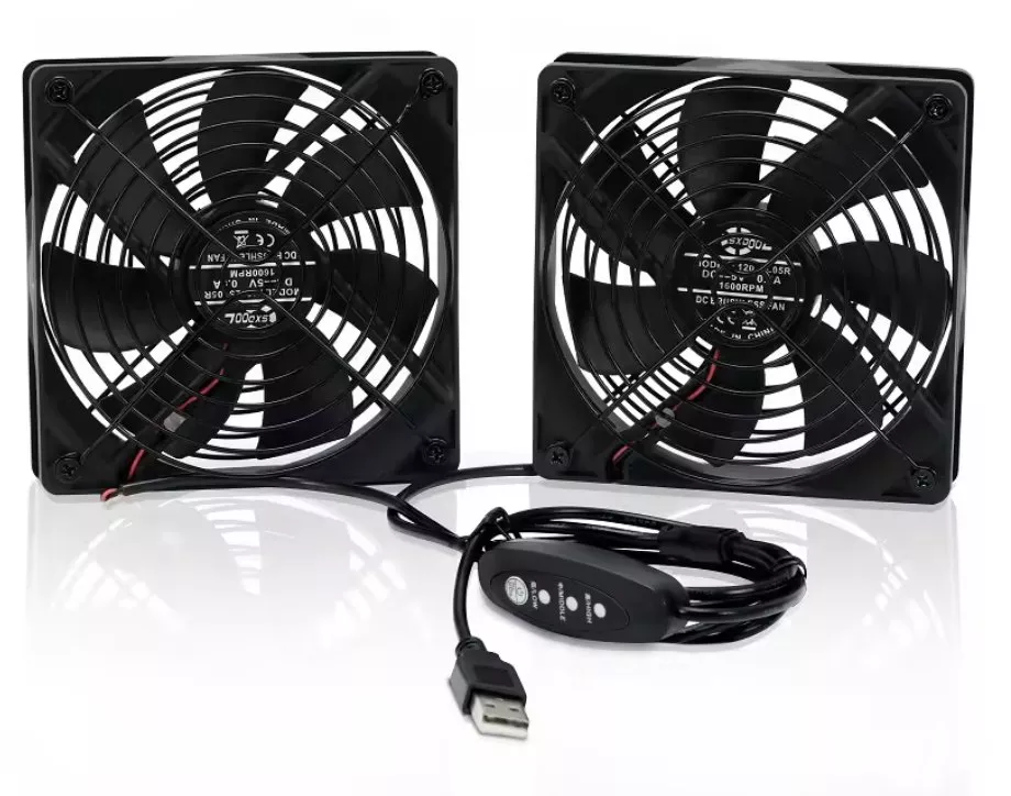 The fans which I bought from AliExpress run from a USB charger. The control in the lead had to go as it defaults to off when powered up. I mounted the fans above the inverter in a housing made from 3D printed fan mounts glued together and gaffer taped to the inverter. This serves its purpose but isn't getting a photo in this write up. Running it from a timer produces a big change in the temperature graph.