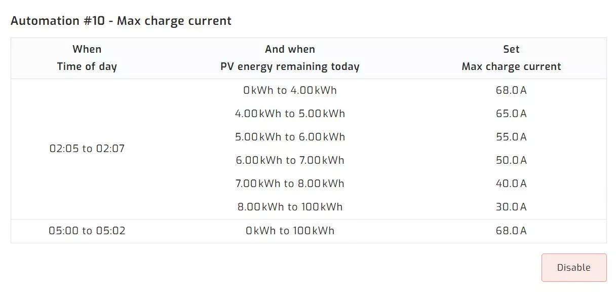 To reduce that temperature rise when there is only a modest amount of charge needed which can be spread out over a longer period I have added an extra automation that reduces the maximum charge current. This just gets set at 02:00 and reduces the charge current based on how much will be put into the battery based on the solar estimate. It is set back to a high value at the end in case there is an Octopus free power day when a fast charge will be needed.