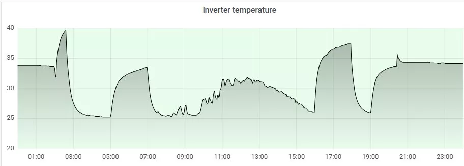 The Inverter Temperature chart shows steep temperature rises during import and forced export as well as when there is plenty of PV power being produced.