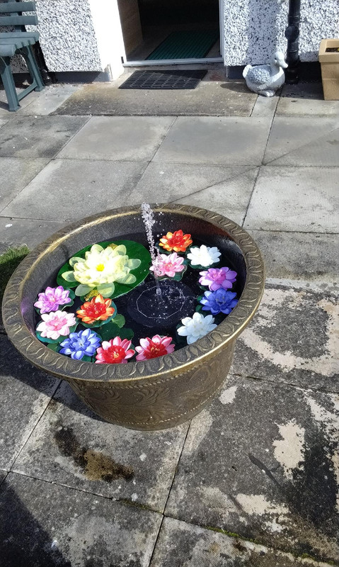 No Gnomes here, an old big heavy statue of an Old English Sheepdog, a duck, a family of Tortoise's and several painted stones that I did a few years ago. Finally my big fancy tub that's full of water, it's got a solar fountain floating in it that lights up at night if it's had enough sun through the day, along with some artificial water lilies.